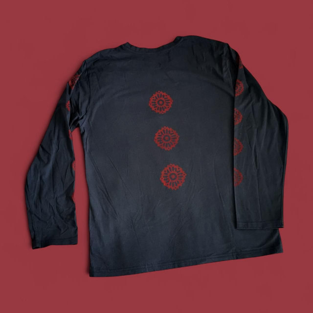 T-shirt longues manches noir de seconde main imprimé à la main en rouge avec une linogravure réalisée par mes soins ❤️